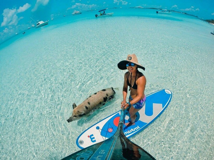 Простота крепления камеры и куча дополнительных «плюшек» позволяют туристам обходиться даже без селфи-палки, когда срочно требуется сделать кадр. Эта девушка прикрепила свою GoPro на весло и смогла щелкнуть себя с необычной гостьей — пятнистой свинкой.