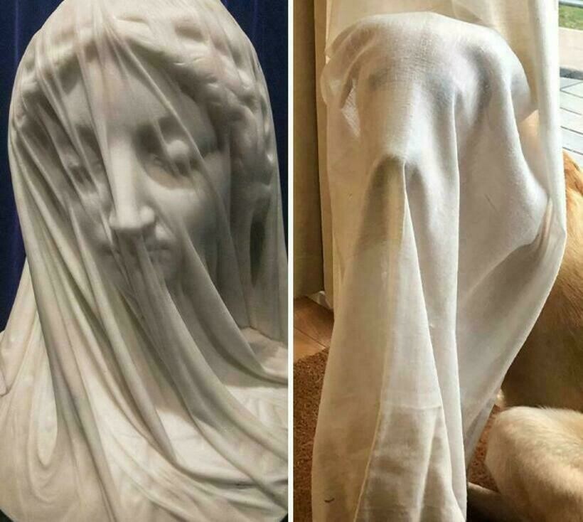 Пёс за занавеской имитирует знаменитую скульптуру «Дева под вуалью» Джованни Страцца