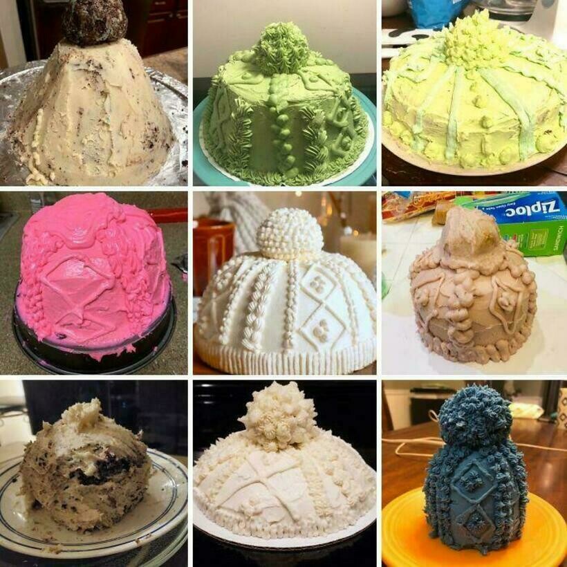 Пример торта, на который они равнялись, показан в центре фотоколлажа. Остальные снимки — то, что получилось у участниц.