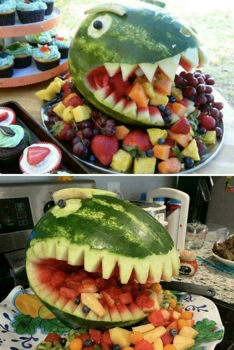 На день рождения сына мама решила вырезать голову динозавра из арбуза