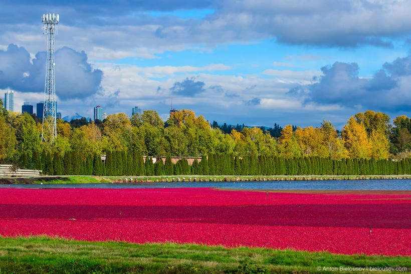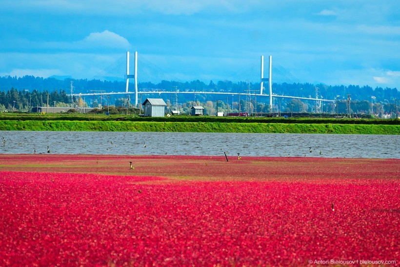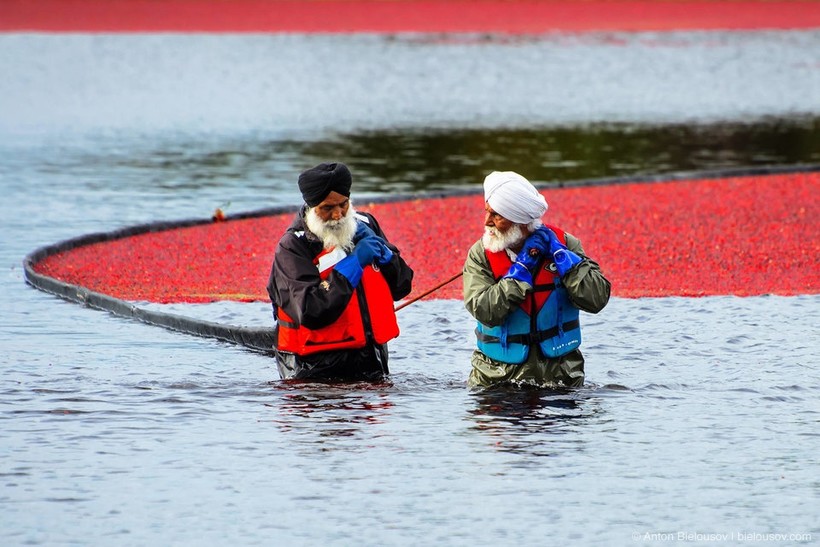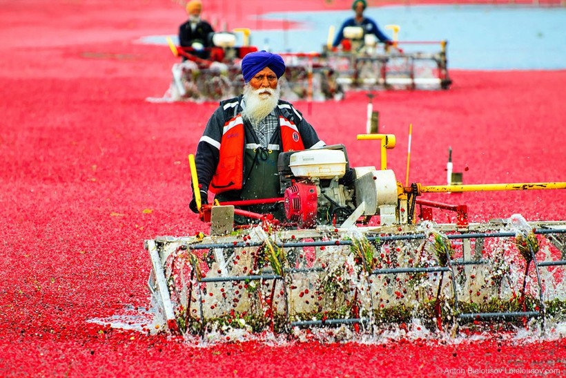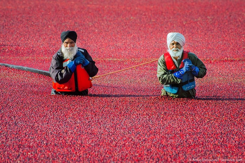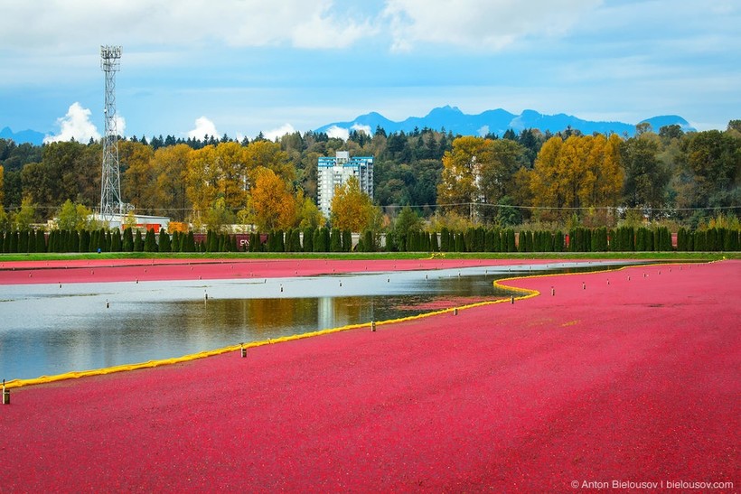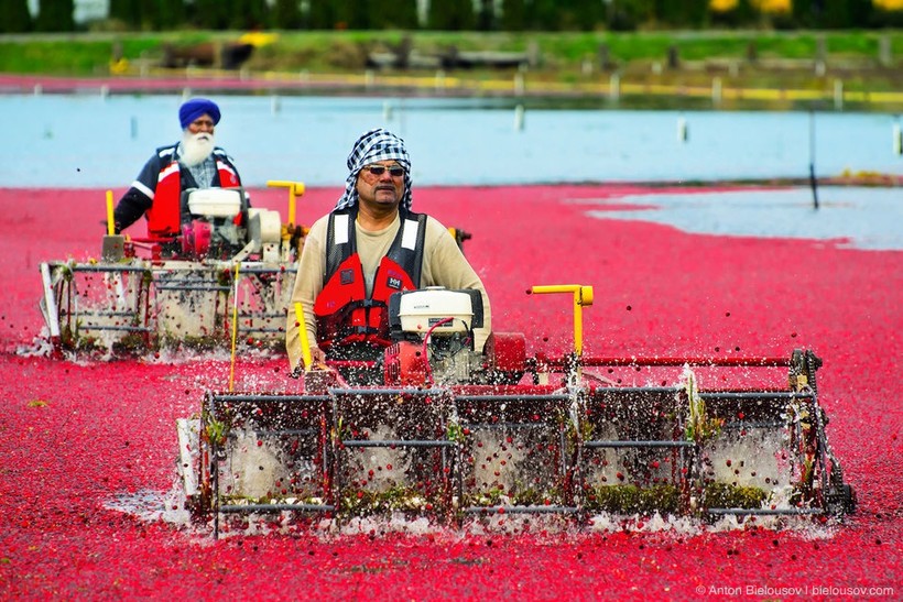 Захотелось немного колорита в стиле National Geographic, поэтому 10 минут вождения — и мы перенесемся ненадолго в Новую Индию. Ну как в Индию — в восточный Ричмонд (пригород Ванкувера) на противоположном берегу реки Фрейзер. Здесь на клюквенных полях поспел урожай, что само по себе не повод для праздника (хотя в некоторых городках — повод, да еще какой), если бы не зрелищность того, как его собирают — когда еще в Ванкувере увидишь разлившееся красное ягодное море?