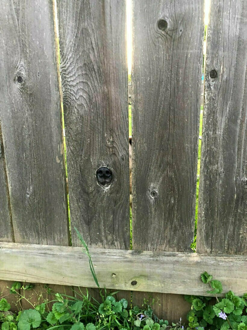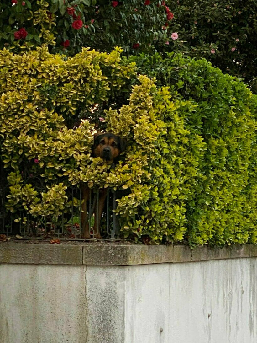 Хозяин специально сделал псу дырку в живой изгороди, чтобы он мог наблюдать за прохожими, когда скучает один дома