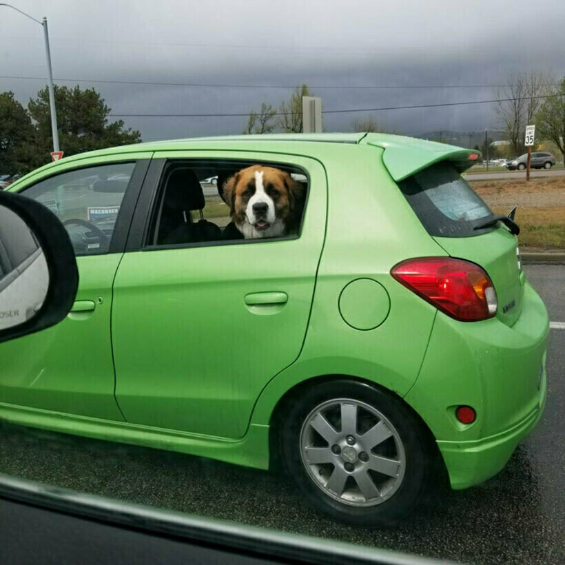 Очень неожиданно в такой маленькой машине увидеть выглядывающего в открытое окно крупного пса