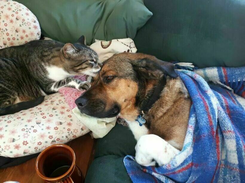 Травма несерьезная, но хвостатый немного расстроился, и кот решил его поддержать.