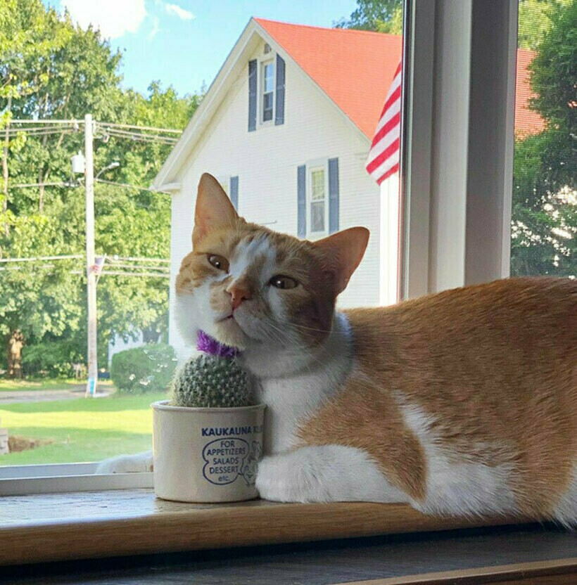 Хозяин кота специально купил кактус, чтобы отучить любимца лежать на подоконнике
