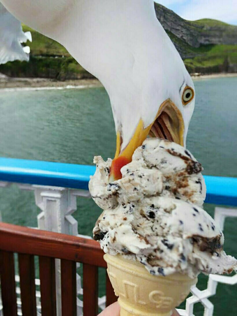 В тот момент, когда автор снимка хотел сделать фотографию мороженого, наглая чайка подлетела и набросилась на лакомство