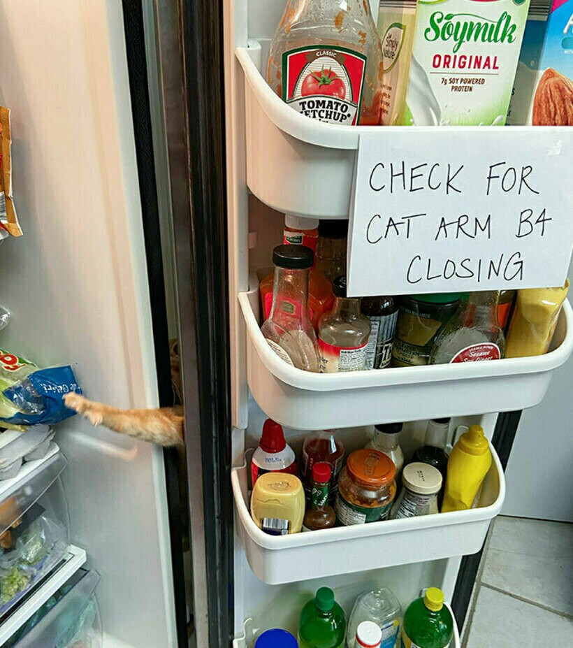 Забавное напоминание о том, что перед закрытием дверцы холодильника следует убедиться, не просунул ли кот свою лапку в щель