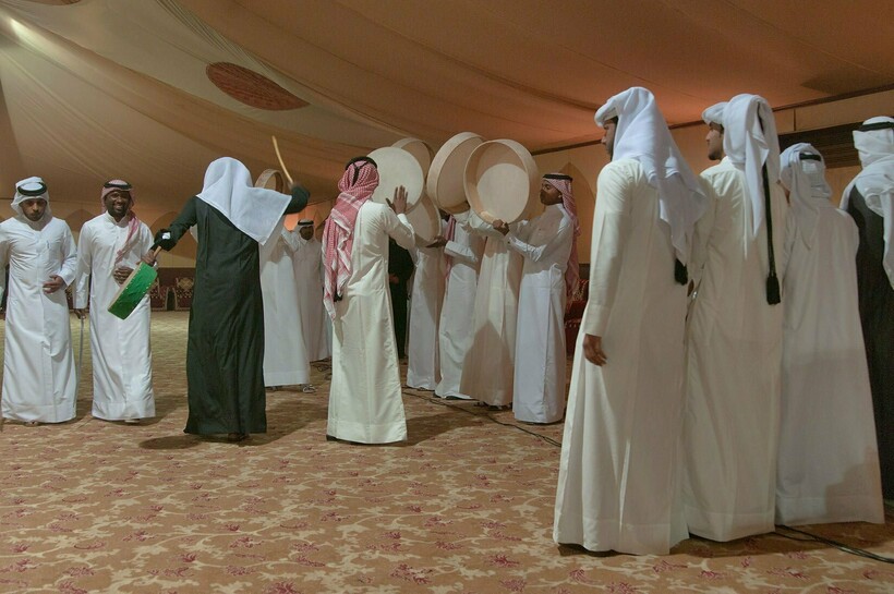 Для восточных стран традиционно гендерное разделение во многих сферах. Так, празднование свадьбы тоже вошло в эту категорию. Мужчины с женихом располагаются в праздничном шатре, а после поздравлений отправляются ужинать. Женщины отмечают действо в других залах, танцуют, едят сладости и осыпают невесту деньгами в качестве обряда. Молодые видятся только в самом конце свадьбы.
