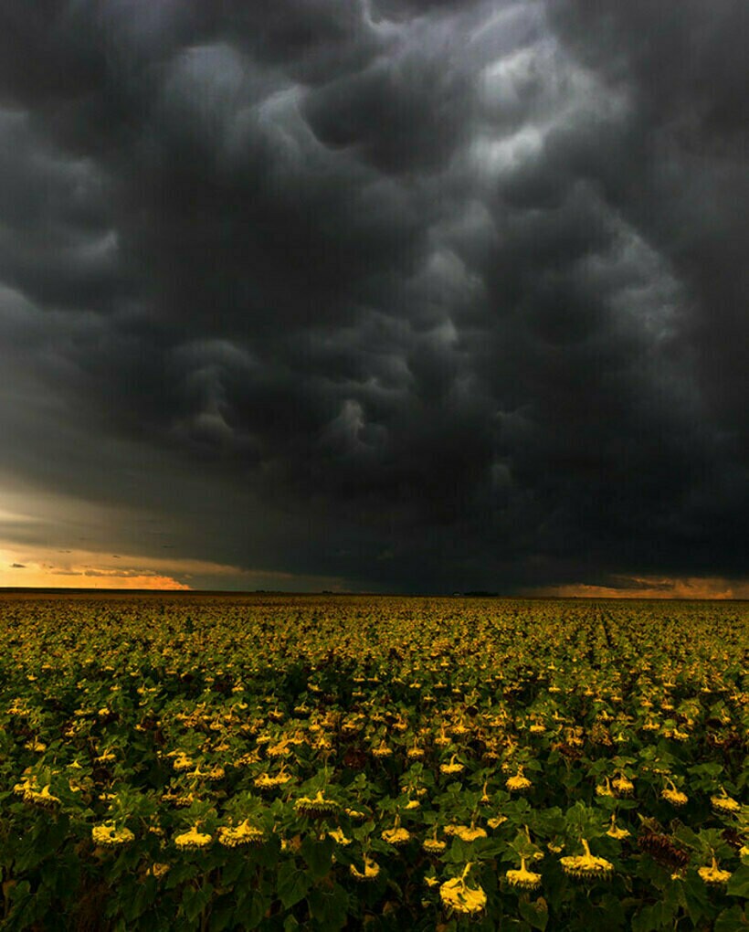 Огромное грозовое облако, нависшее над полем с подсолнухами, производит пугающее впечатление