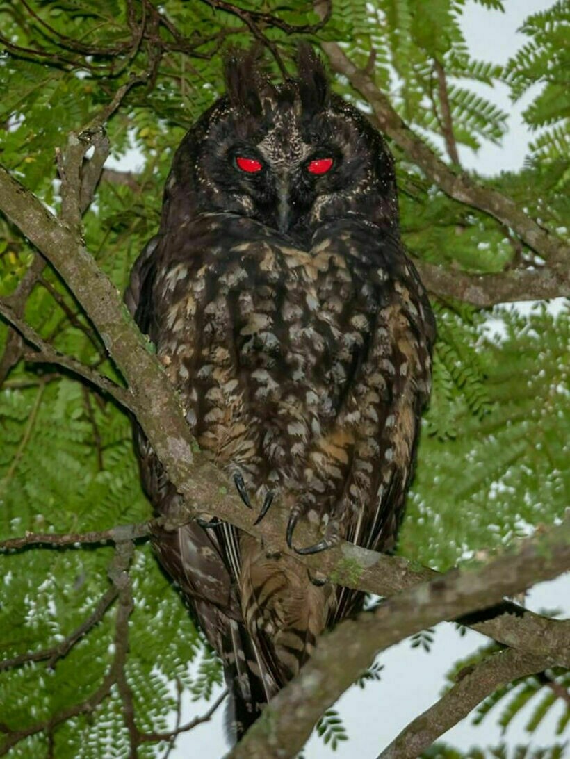 Она мало чем отличается от других ушастых сов, за исключением одного: при искусственном освещении ее глаза выглядят ярко-красными.