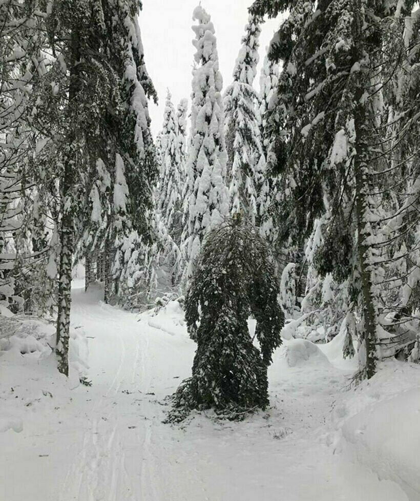 Автор снимка увидел это заснеженное дерево, похожее издалека на человеческий силуэт, во время катания на лыжах