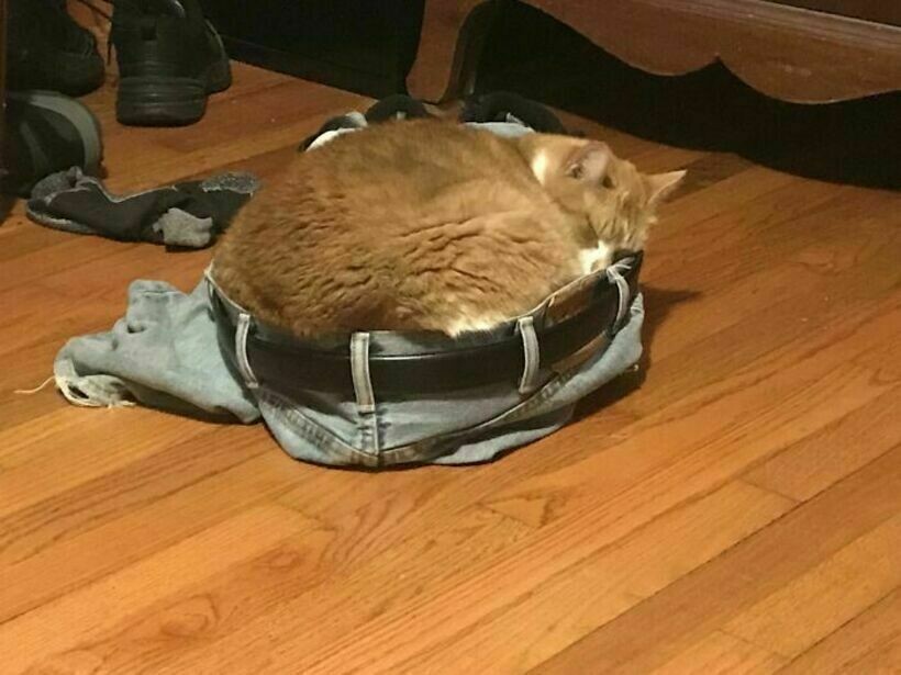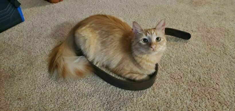 Стоило бросить ремень на пол, как в нем уже сидит котик