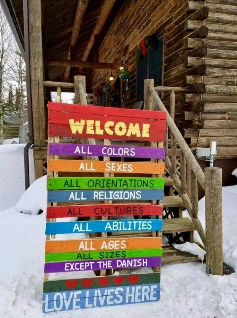 «Добро пожаловать людям всех цветов кожи, всех полов, всех ориентаций, всех религий, культур, особенностей, возрастов и размеров. Кроме датчан. Любовь живет здесь».
