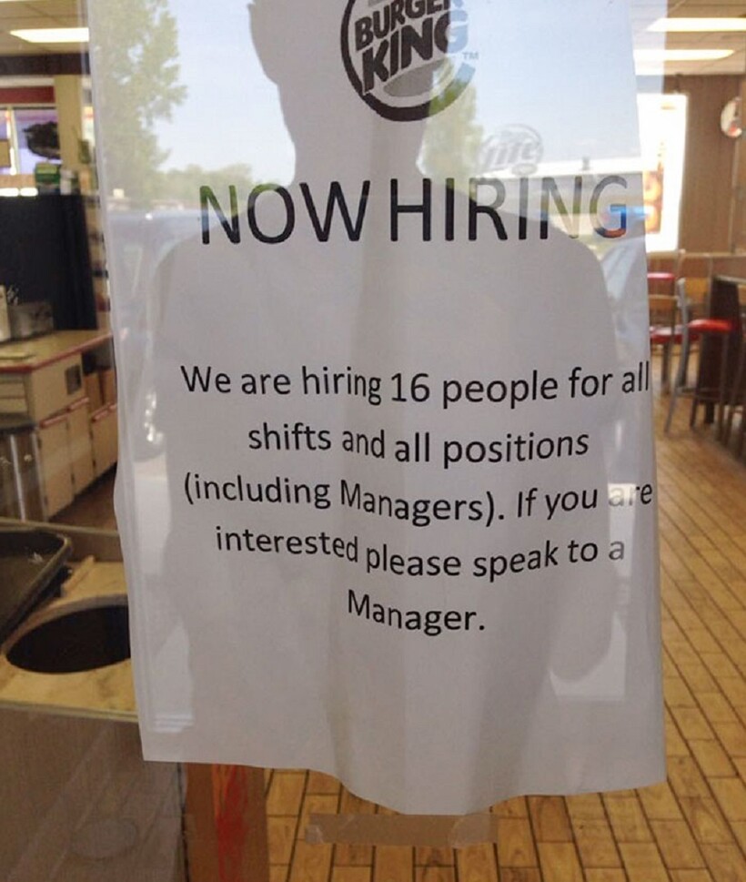 «Мы примем на работу 16 человек на все смены и должности (включая менеджеров). Если вы заинтересованы, пожалуйста, поговорите с менеджером».