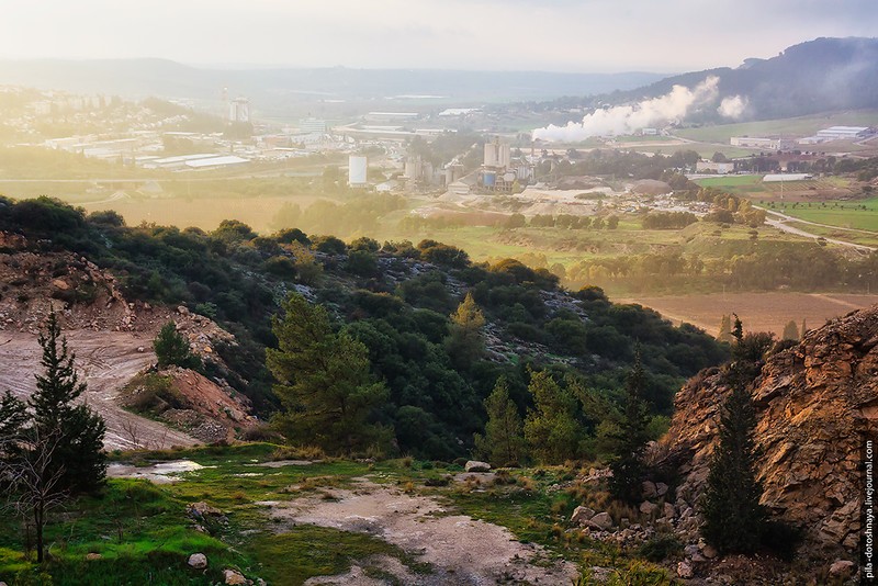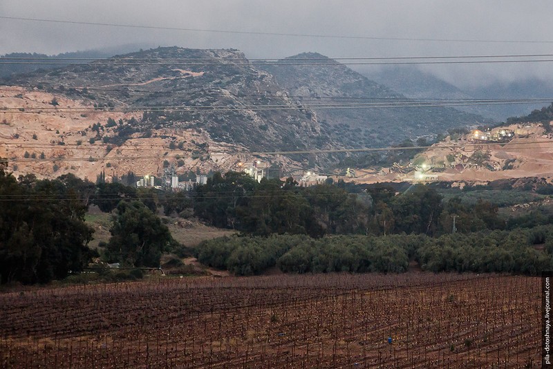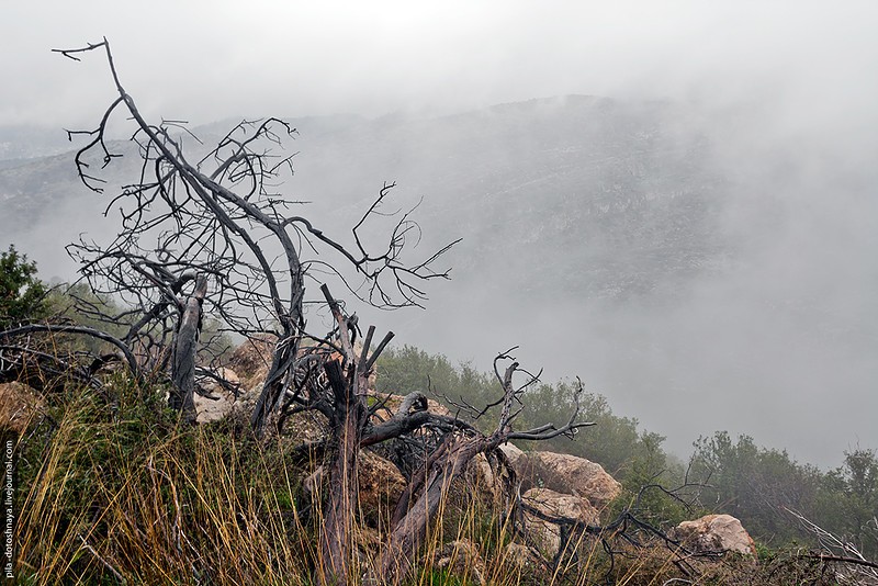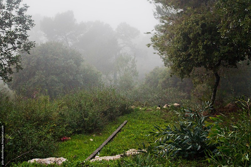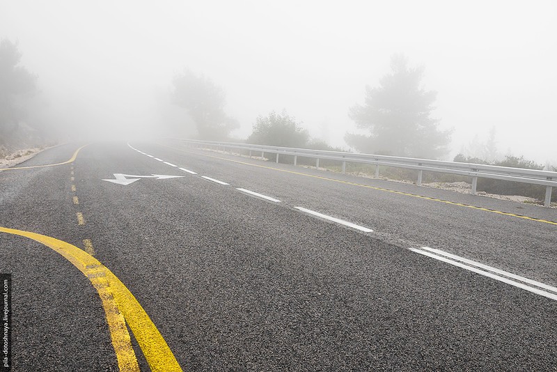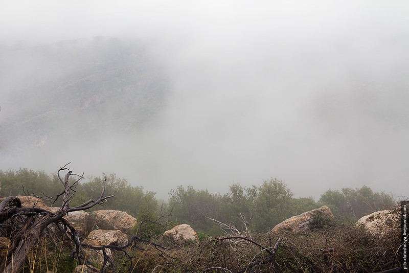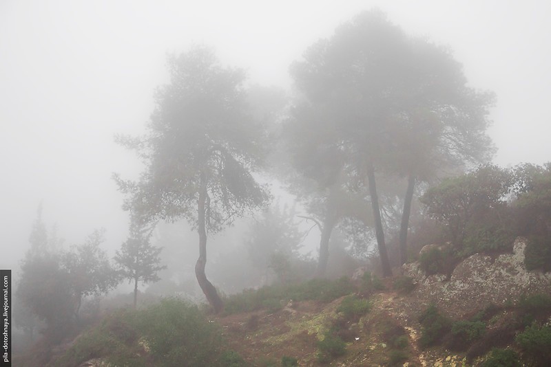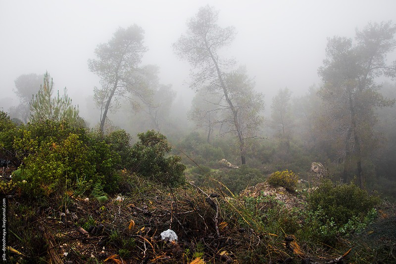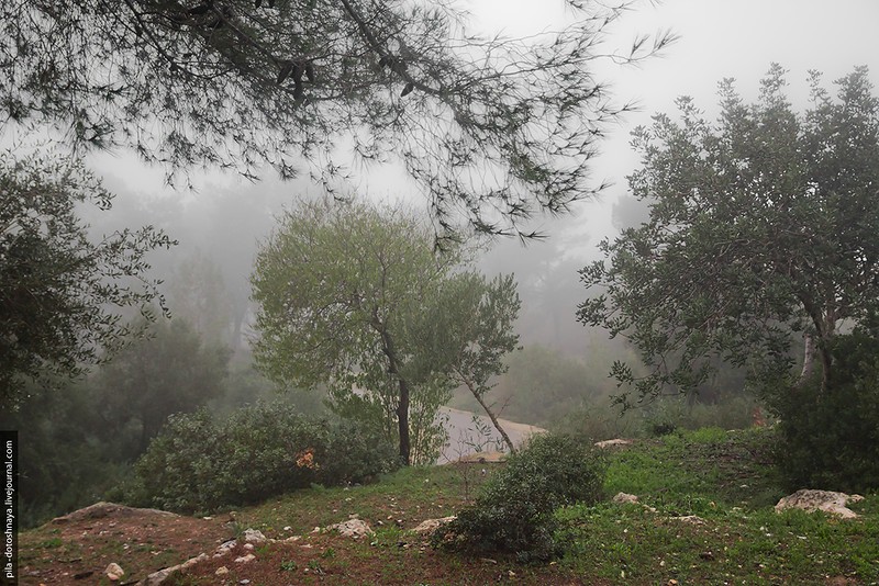 На самом деле мы ехали в пещеру Сорек. Заранее проверили время работы, но что-то пошло не так — приехали, а там закрыто. Но что пещера...мы оказались на высоте 350 метров в абсолютном тумане, на обочине дороги торчали ели и зеленые деревья, а за ними не было ничего, туман съел все. При такой видимости мы все же набрели на ферму.