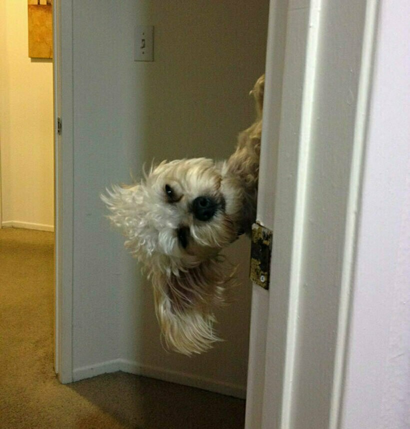 Супруги любят подшутить друг над другом при помощи неожиданно выглядывающей из-за двери или угла собаки