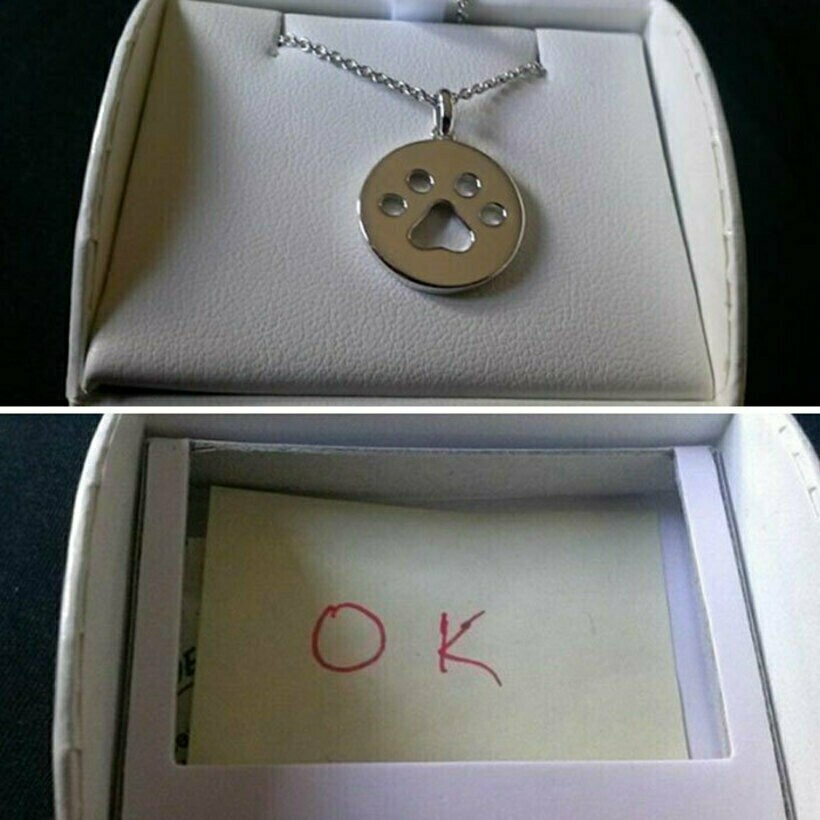 И вот в Рождество она получила подвеску с отпечатком лапки, а под ней в коробочке находилась записка: «Хорошо».