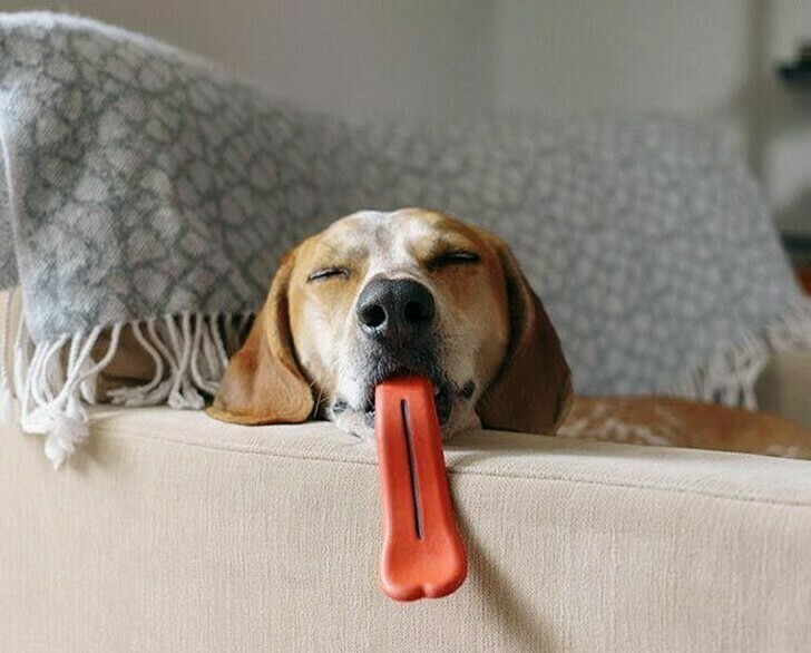 Пес уснул со своей любимой игрушкой во рту, а хозяин успел сделать забавное фото.