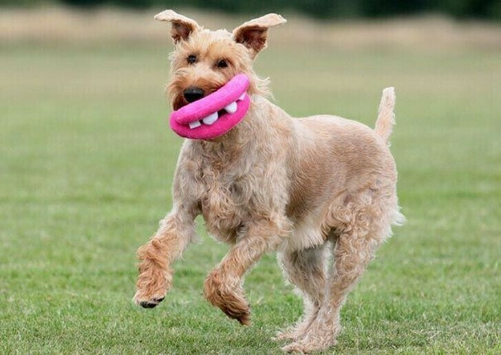 Авторы некоторых мультиков любят рисовать своим персонажам боковую улыбку. Этот пес с игрушкой смотрится так, будто его создал какой-то мультипликатор.