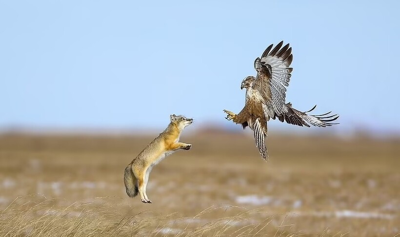 Китайский фотограф Баочжу Вана путешествовал по Монголии, когда стал свидетелем необычной сцены: схватка хищной птицы и степной лисы. Ван рассказал, что и птица канюк и лиса корсак охотятся на одну и ту же дичь — мелких птиц и грызунов, а потому часто соперничают друг с другом. Фотограф также сказал, что произошло после щелчка затвора: канюк решил не сражаться с лисой и улетел.