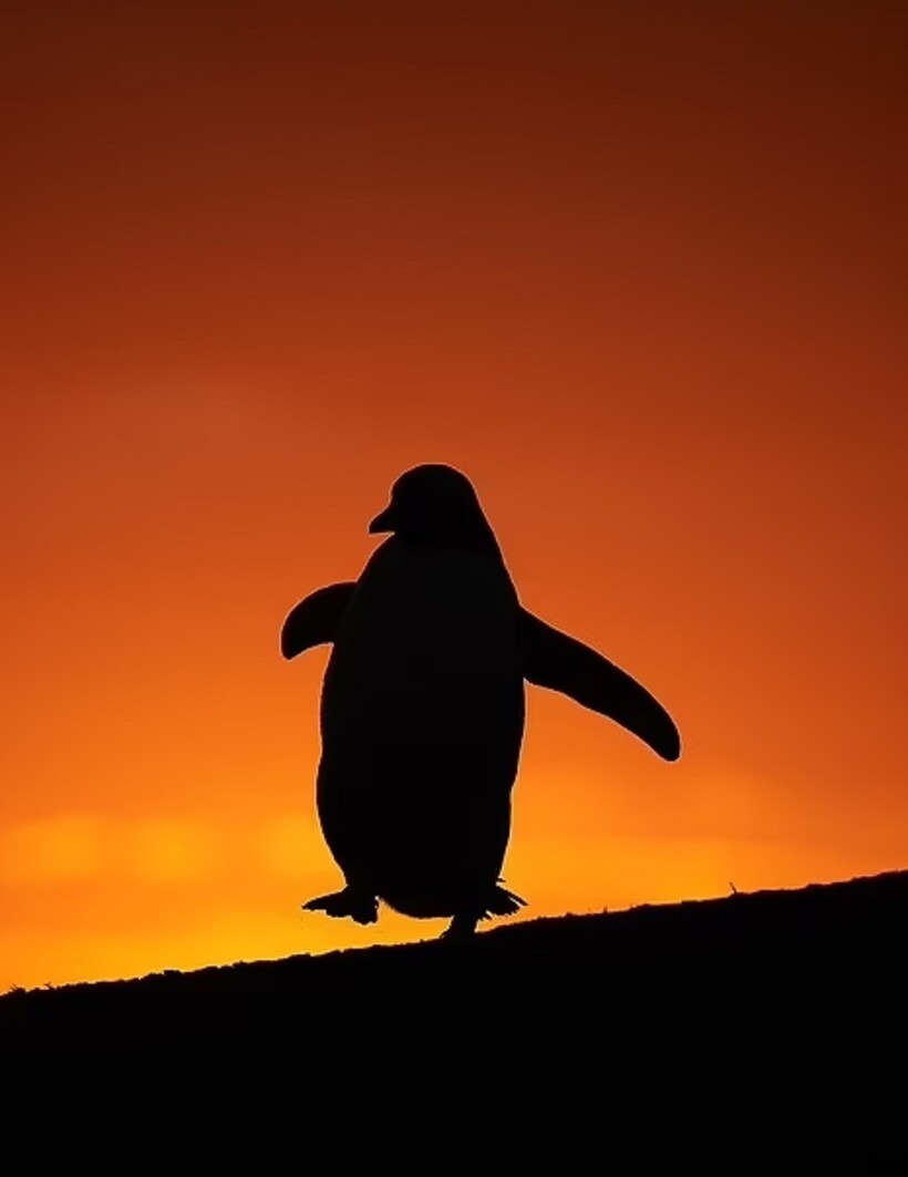 Британский фотограф Одри Вуллер рассказала, что отправилась на Фолклендские острова специально, чтобы сделать красивый кадр пингвина на закате. Для подходящего кадра женщина пролежала на земле около часа, карауля нужного пингвина, и этот Генту показался удачным: он словно танцевал на ходу. Кстати, силуэтная съемка стала творческим жанром для этого индийца, ставшего знаменитым на весь мир.