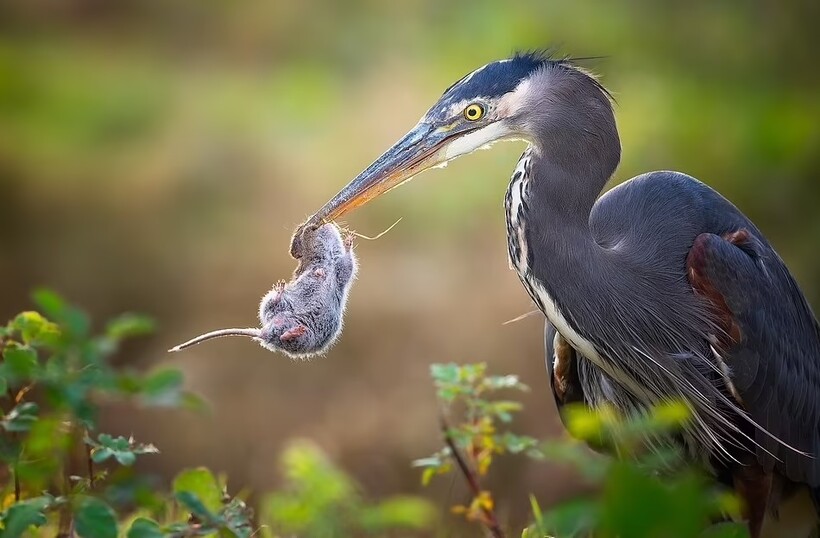 Американец Гленн Нельсон живет в Сиэтле, где голубые цапли считаются символами города. По этой причине фотограф решил послать на конкурс именно эту пернатую представительницу. Целый год мастер вел фотоохоту на цапель, выбирая место у воды, но однажды он решил остановиться в поле и стал свидетелем необычного обеда: цапля поймала полевку. Это весьма странно, ведь в 95% случаев цапли едят рыб и лягушек.