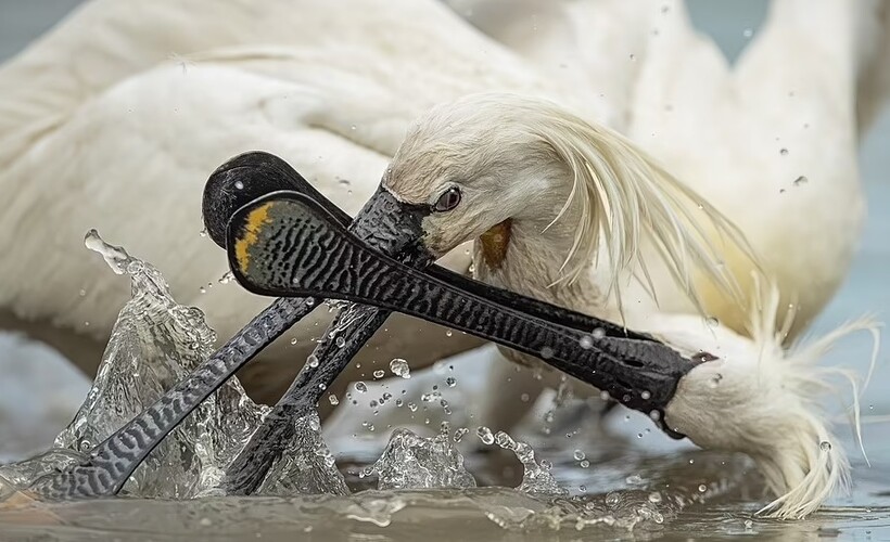 Венгр Габор Баросс целый день наблюдал за белыми колпицами у озера в национальном парке Хортобаджи, Восточная Венгрия. Обычно колпицы избегают конфликтов, но в какой-то момент прилетела птица с сильно выраженными территориальными инстинктами. Скорее всего, это был самец, и он начал прогонять других птиц, пока ему не попался такой же «собственник» и не началась драка за место под солнцем.