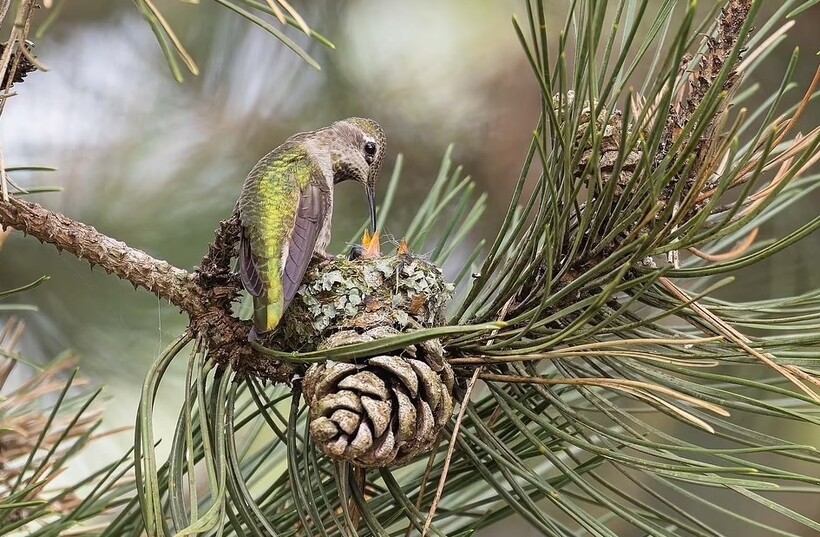 На этом снимке не одна птица, а три: мать и два птенца, которых она прилетела покормить. Канадский фотограф Лирон Герцман рассказывает, что близ Ванкувера нашел место, где гнездится необычный вид колибри — Калипта Анны. Колибри очень боязливые птицы, и чтобы не пугать их во время строительства гнезд и откладывания яиц, Лирон приходил в то место каждый день, но не больше чем на пару минут. Но и этого времени хватило, чтобы сделать удивительный кадр.