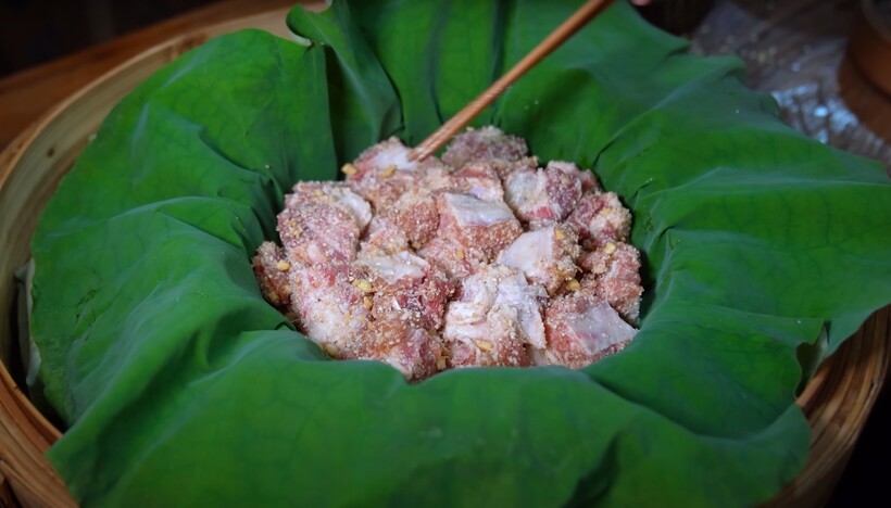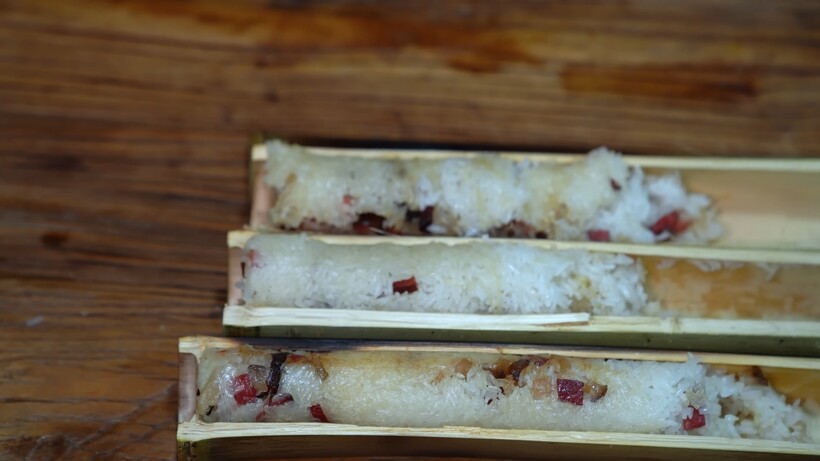 Но интересней всего блюдо в бамбуке. Плотный бамбук трудно подготовить, но он даст блюду неповторимый древесный аромат, что стоит хлопот. Смешав рис с копченым беконом, девушка набивает бамбук и закупоривает один край листом лотоса. Бамбук она будет готовить на мангале, отчего рис впитает в себя аромат угля и древесины. Кстати, своеобразной подаче такого блюда позавидуют современные брендовые рестораны: достаточно разбить бамбук и подать рис прямо в нем! Это напоминает приготовление дорогой бамбуковой соли, о которой мы писали в этой статье.