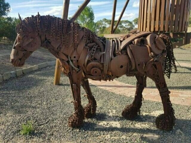 Мастер сделал фигуру лошади из старого ржавого металлолома.