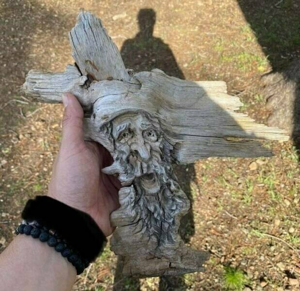 Парень обнаружил около водоема корягу, на которой было высечено лицо.