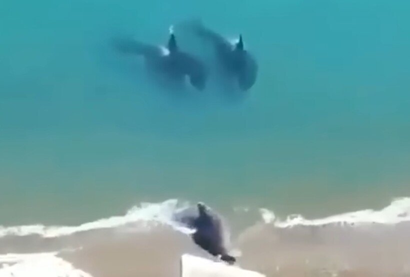 В этом фрагменте две косатки загнали на берег крупного тюленя и караулят его. Ситуация кажется интересной и интригующей, но не для тюленя. Кстати, косатки крайне редко нападают на человека, не считая его привлекательным и вкусным, но всегда есть воля случая, когда киты путают людей в черных костюмах с теми же пингвинами или тюленями, хватая их за ноги и утягивая на глубину. Так же могут делать дельфины в порыве игры.