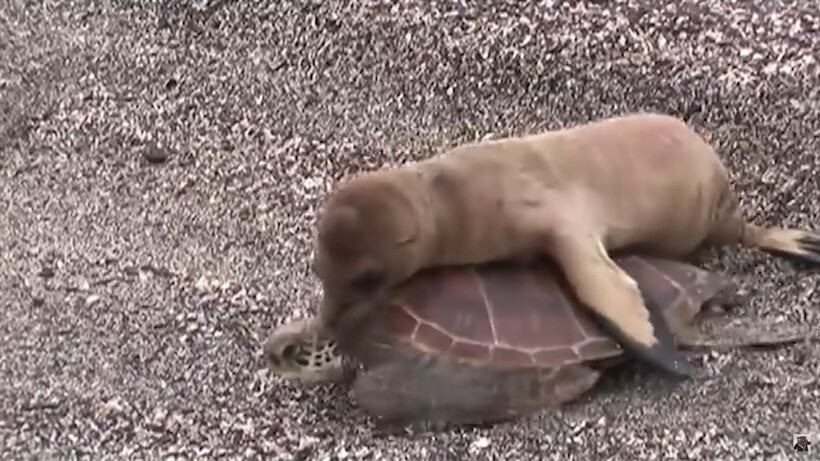 Беря пример со львенка в мультфильме, этот маленький тюлень решил покататься на черепахе, как коты предпочитают проехаться верхом на роботе-пылесосе. Это изрядно позабавило окружающих людей на пляже. Но мало кто знает, что эти животные не играют между собой: они вызволяют друг друга, что доказали американские морские зоологи. Они не раз наблюдали, как тюлени подхватывают и тянут наверх морских черепах, когда тем надо глотнуть воздуха, но мало сил. В этой же статье мы показывали редких созданий, пойманных в объектив видеокамеры.
