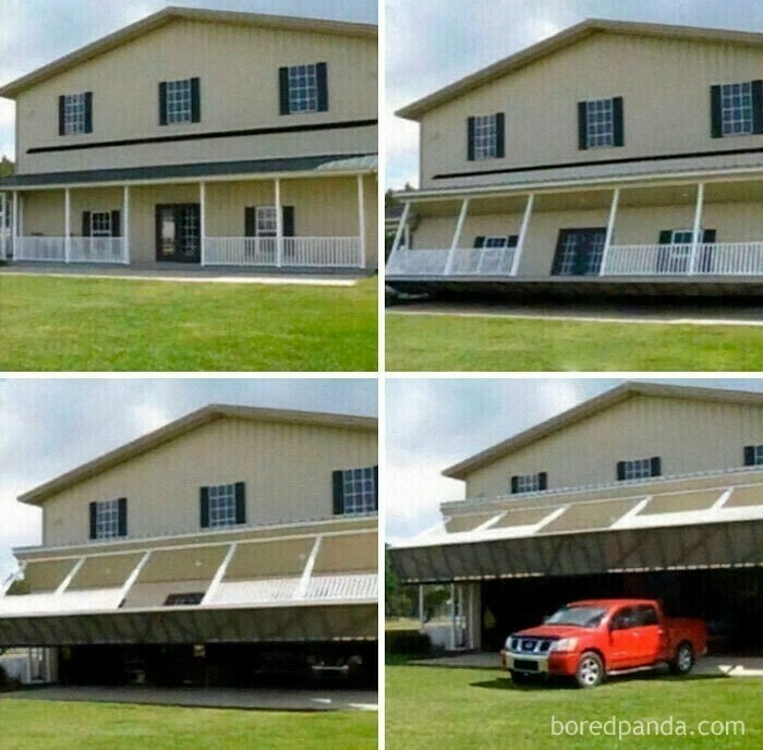 Замаскировать гараж под верандой было интересным решением. Представьте, если кто-то будет отдыхать на ней в кресле, как вдруг веранда начнет подниматься.
