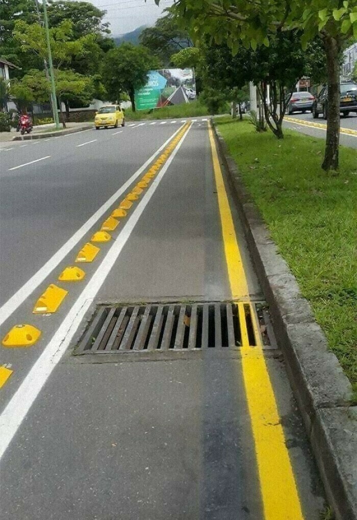 Для велосипедистов поездка по этой дорожке может очень плохо закончиться. Колесо может застрять в решетке ливневой канализации.