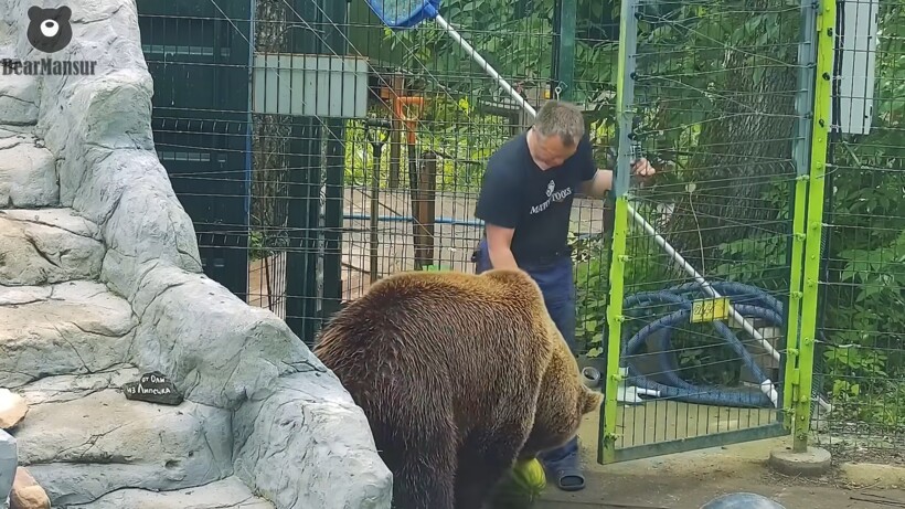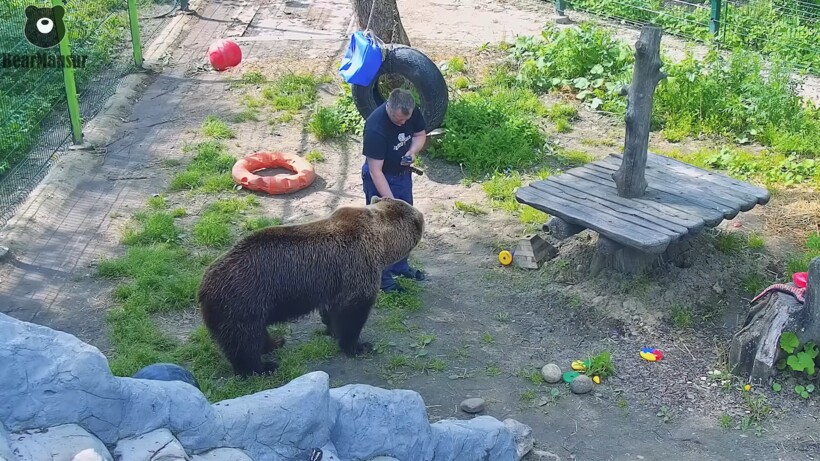 Медведя по кличке Мансур нашел в лесу неравнодушный мужчина, который сжалился над одиноким зверем и решил забрать его домой. С тех пор они неразлучны. Мишка считает хозяина своим лучшим другом, и у него даже не возникает мысли как-то его обидеть. Несмотря на то, что Мансур в несколько раз больше и сильнее хозяина, мужчина не боится заходить к нему в вольер и проводить со зверем время. Понаблюдать за тем, как медведь забрался в дупло в поисках меда, вы можете в другом нашем материале.