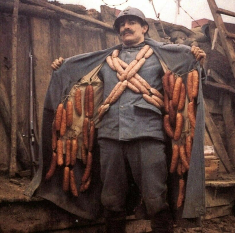 Этот снимок был сделан во Франции во времена Первой мировой. Такие торговцы колбасой ходили по окопам и предлагали военным свою продукцию.