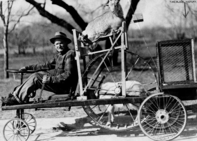 Фермер изобрел странное средство передвижения, которое приводил в действие козел, бегающий в колесе. Если один козел уставал, ему на смену приходил второй.