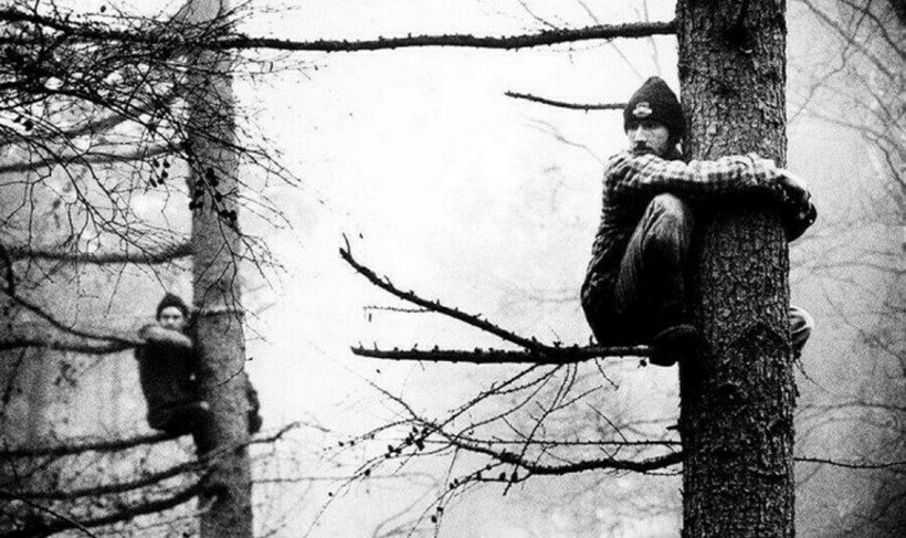 Фотография была сделана в конце 90-х годов прошлого столетия. На ней изображены протестующие против строительства новой автомагистрали, ради которого пришлось бы вырубить гектары леса.