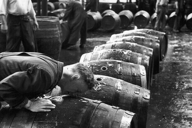 На снимке запечатлен за работой так называемый «нюхач», который проверяет качество и чистоту пивных бочек.