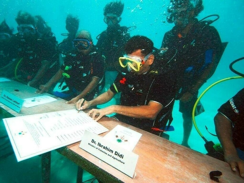 В 2009 году президент Мальдив Мохамед Нашид решил привлечь к проблеме глобального потепления как можно больше внимания и провел получасовое совещание под водой.