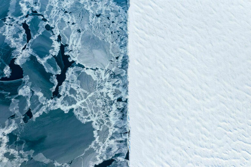 Этот кадр, сделанный Флорианом Леду в Норвегии, прекрасно показывает переменчивость льда. Справа он скучный, но плотный и безопасный для человека или белого медведя, а слева — прекрасная феерия тонкого льда, дрейфующего в морозной воде.