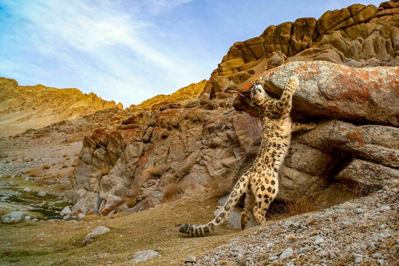 Индиец Сандеш Кадура смог сфотографировать снежного барса, чей окрас меняется в зависимости от времени года и высоты гор. Там, где высоко и холодно, барсы серые, а где тепло и низко — коричневые. Все это, чтобы уметь сливаться с природой.