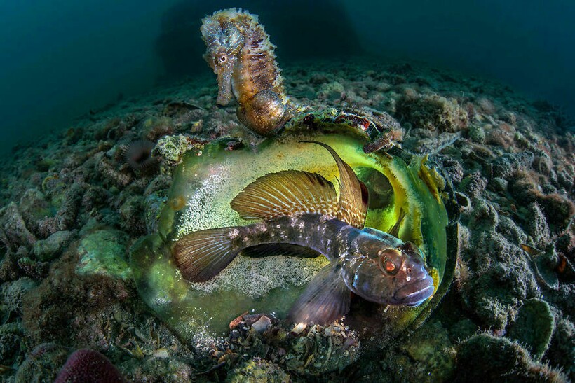 Итальянец Доминико Роскиньо во время дайвинга смог снять поразительный момент: самец бычка защищает яйца своей партнерши, отложенные в скорлупе рядом с беременным морским коньком.