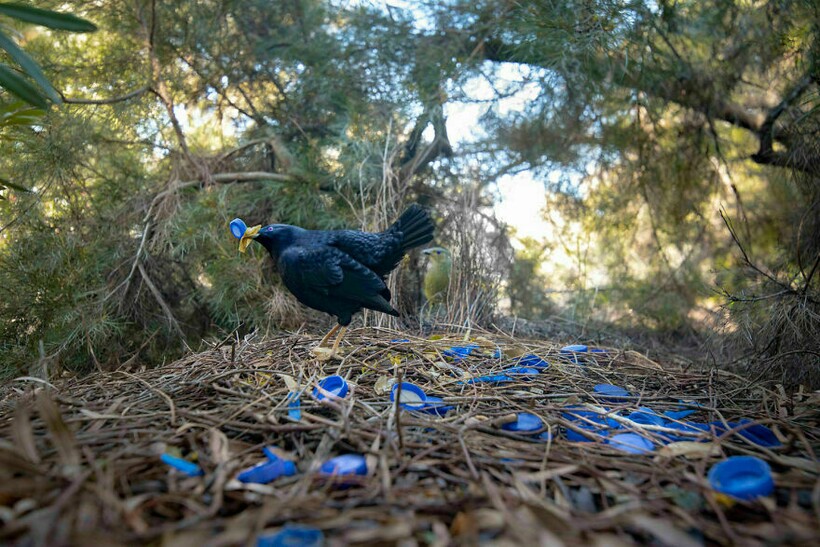 Мэтт Теофил из Австралии показывает шалашника, небольшую птицу, которая во время брачного периода демонстративно крадет разные вещи, к примеру, пластиковые крышки, чтобы вставить их в гнездо и показать самке всю серьезность своих намерений обрести потомство.