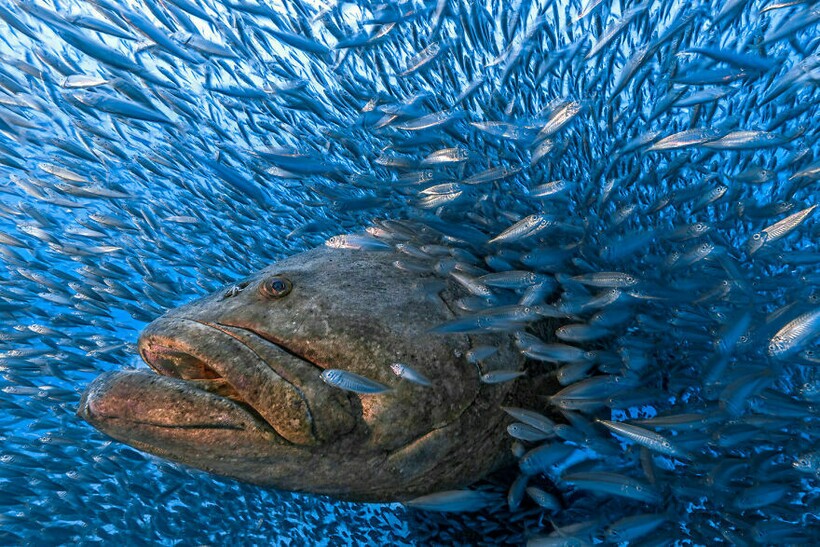 Тот же еврейский фотограф, что снял нерест кораллов, стал обладателем еще одной награды за необычный снимок морского окуня, который намного больше своих соседей, но плывет очень деликатно, словно старается не причинить никому вреда.
