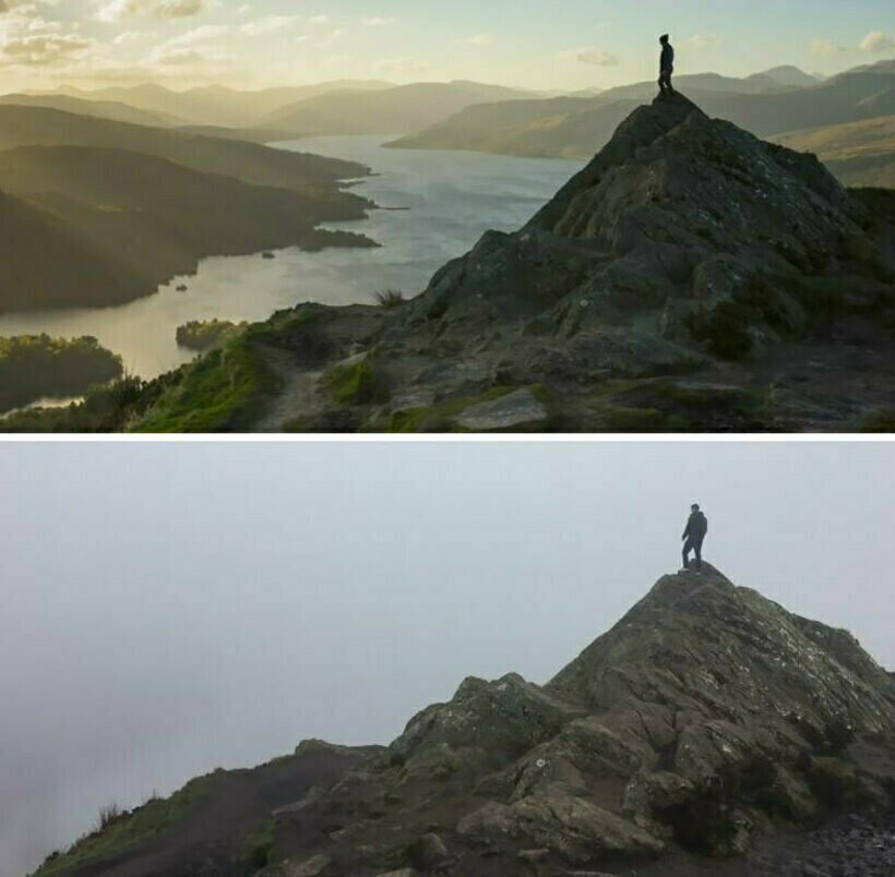 Первое фото — это снимок, который он хотел сделать, а второе — то, что у него получилось. Опять туман всё испортил.