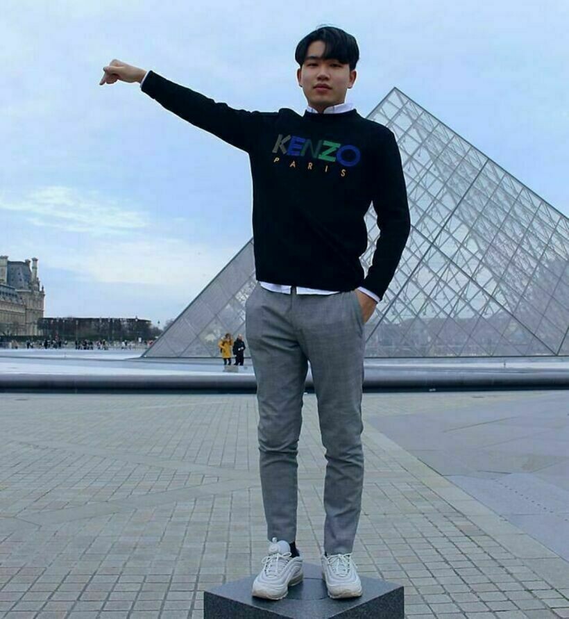 Он хотел снимок, где его палец упирается в вершину пирамиды, что находится позади него