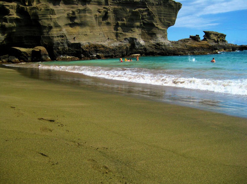 В мире существует два пляжа с зеленым песком: Папаколеа на Гавайях и Талофофо на острове Гуам. Эти побережья получили свой необычный цвет, благодаря кристаллам оливина, которые скалываются с базальтовых отложений, формирующихся, скорее всего, из подводных вулканов. Так как кристаллы оливина гораздо тяжелее большинства минералов, их выбрасывает на побережье, и они остаются здесь, когда прилив уносит легкий песок вместе с водой.