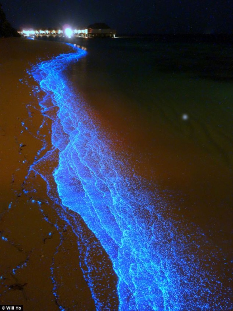 Вообще-то, на самом деле это не песок светится восхитительным синим цветом, а биолюминесцентный фитопланктон, рассеянный по всей береговой линии на Мальдивах. Сияние вызвано экологическим стрессом (выброс планктона на берег). Это невероятное зрелище.